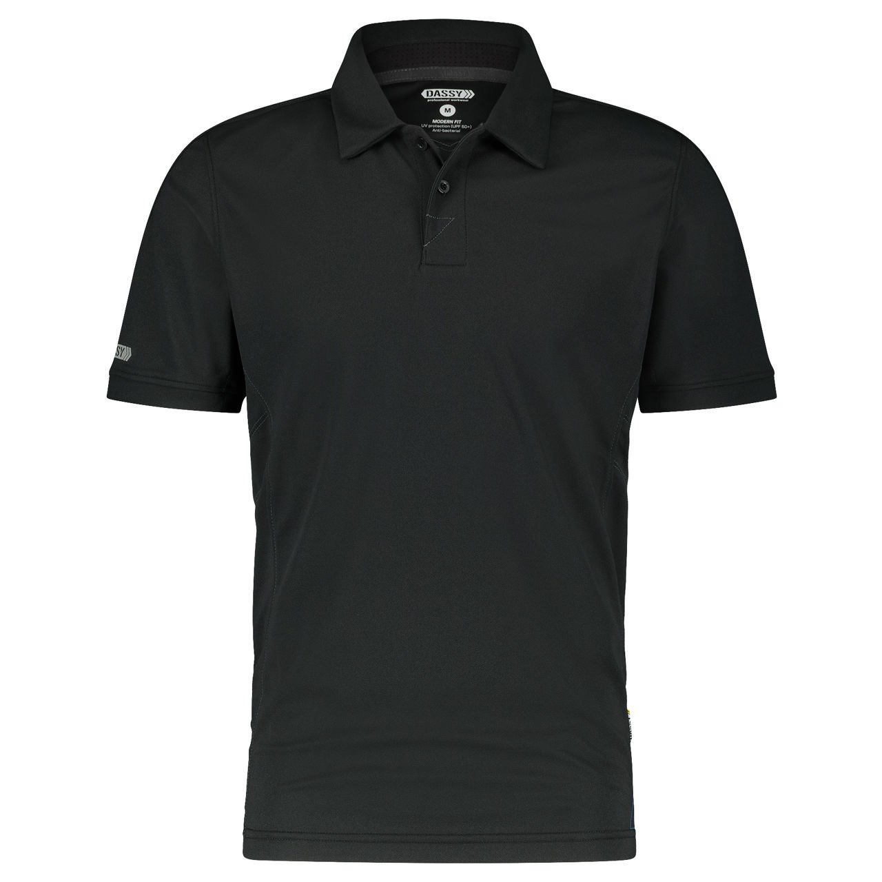 Μπλουζάκι Polo Dassy Traxion black. Δεν είναι απλά όμορφο και εμφανίσιμο, αλλά και πολύ άνετο σε πολύωρη χρήση. Το ελαφρύ και ευχάριστο ύφασμα προσφέρει αντηλιακή UV προστασία από τον ήλιο (UPF 50+). Επιπλέον χάρη στον κρυφό εξαερισμό κάτω από τον γιακά, το μπλουζάκι Polo Dassy Traxion είναι η προφανής επιλογή σας όταν εργάζεστε σε ζεστές θερμοκρασίες ή ακόμη και για την καθημερινότητα ή τις αθλητικές σας δραστηριότητες.
